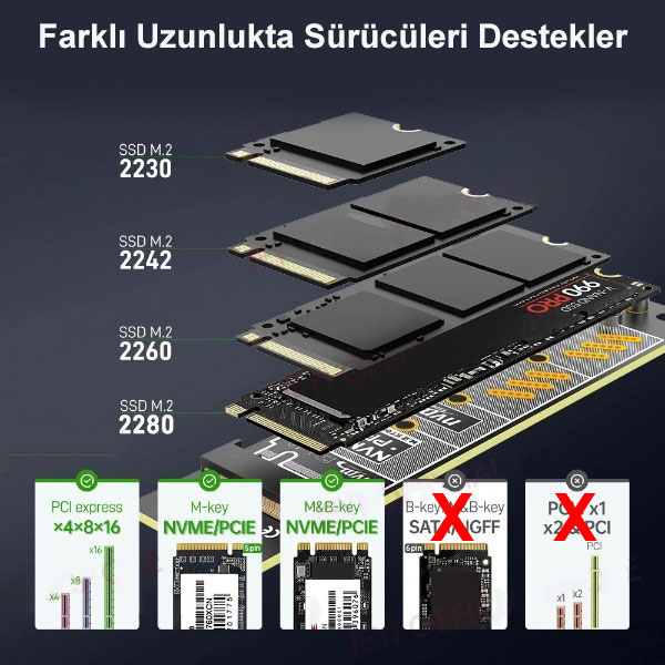 2230/2242/2260/2280 sürücüler ile uyumlu, NVMe SSD sürücüleri destekler. - Sürücü Uyumluluğu : M.2 NVMe (30mm, 42mm. 60mm, 80mm)